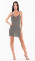 Head jerking and step aside vibes is what the DRE DRE Choker Chain Mini Dress is all about. Featuring an on-trend cowl neckline, stunning individual rhinestone metal fabric with a rhinestone choker chain, double side slits, and mini length. This is a must-have piece for your next party.